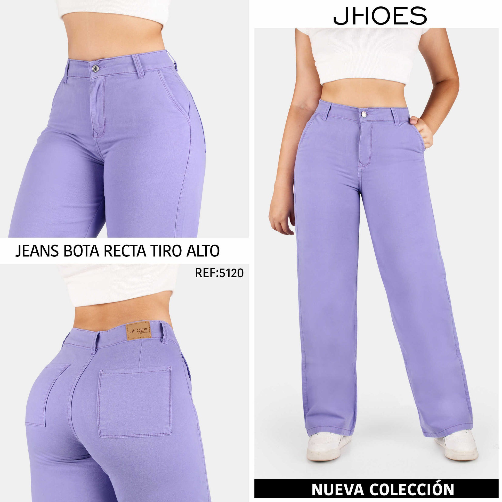 Drill Bota Recta Strech Levanta Cola , tiro alto, tono lila, cintura ajustada, la modelo mide 1.68 cm y usa talla 8.