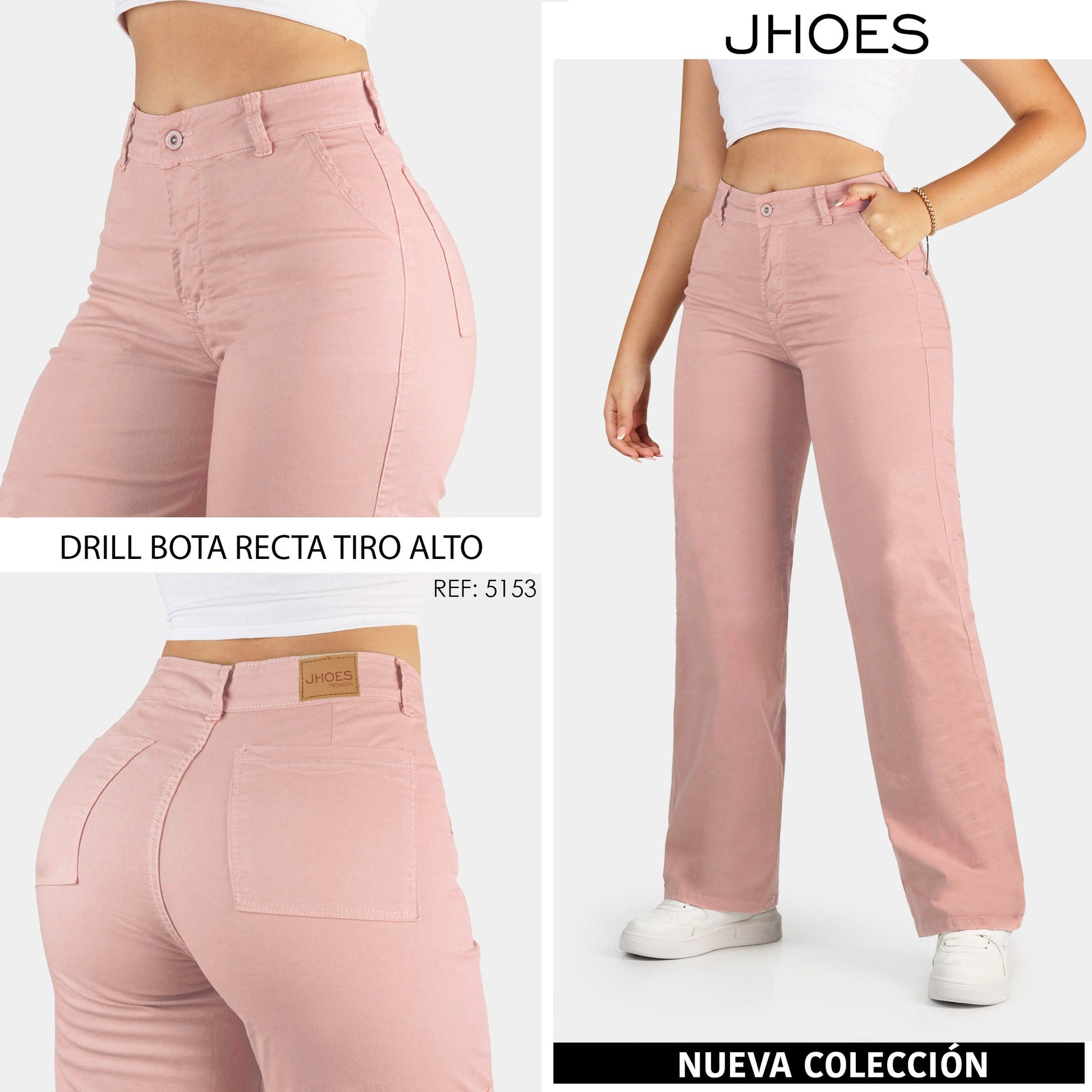 Drill Bota Recta Strech Levanta Cola , tiro alto, tono palo rosa, cintura ajustada, la modelo mide 1.68 cm y usa talla 8.