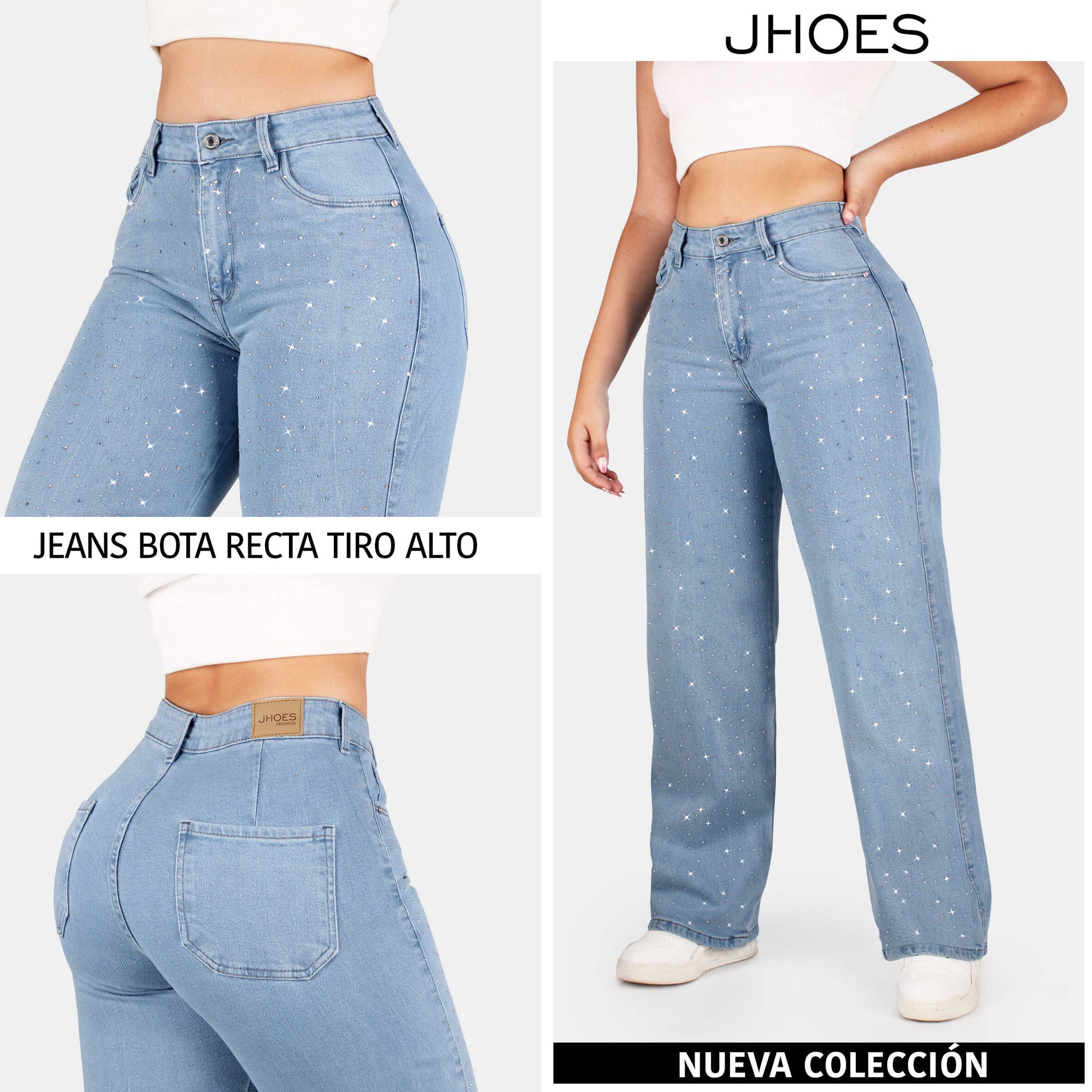 Jean Bota Recta, Strech, con brillos, Levanta Cola , tiro alto, tono azul claro, cintura ajustada, el modelo mide 1.68 cm y usa talla 8.
