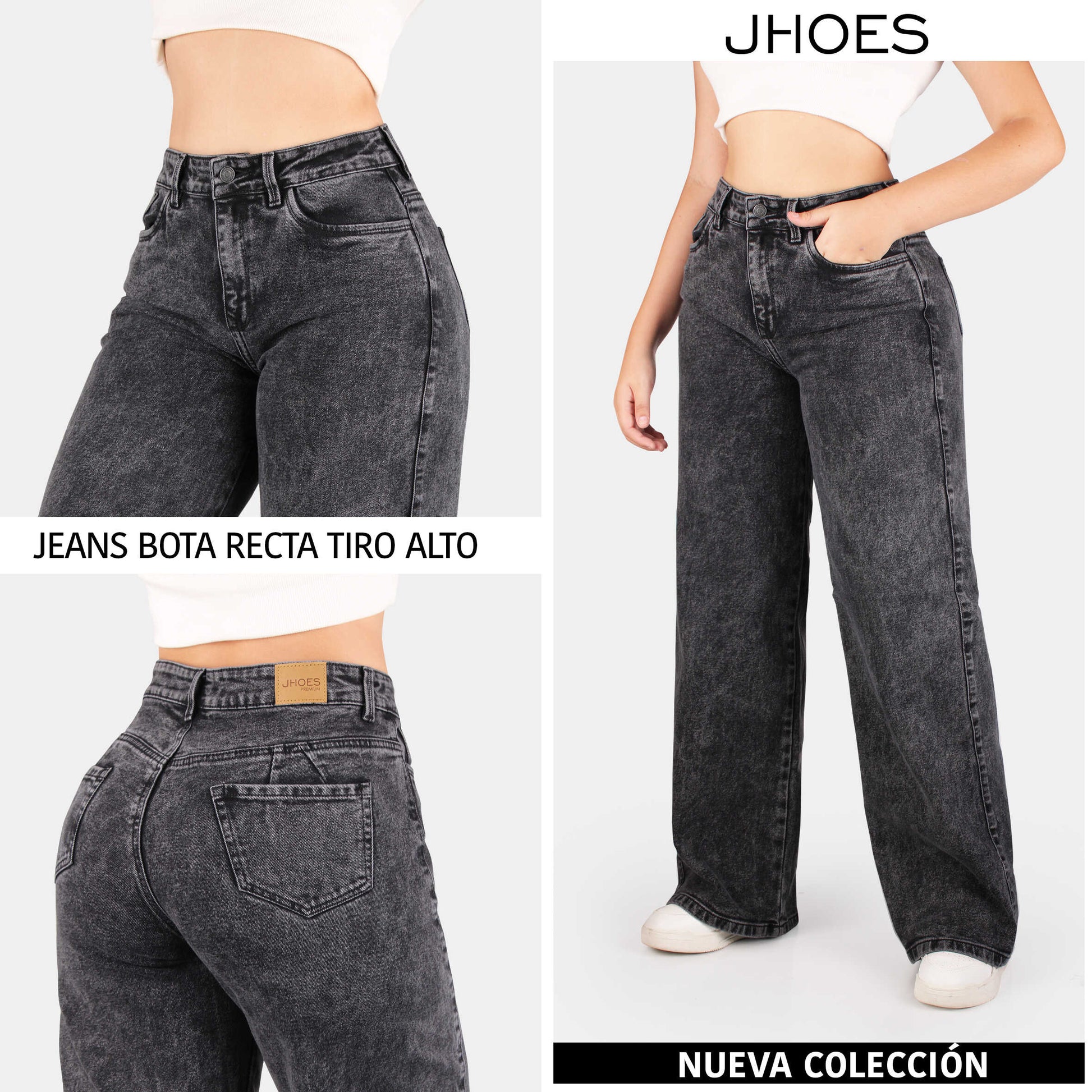 Jean Bota Recta Strech Levanta Cola , tiro alto, tono gris humo, cintura ajustada, la modelo mide 1.68 cm y usa talla 8.