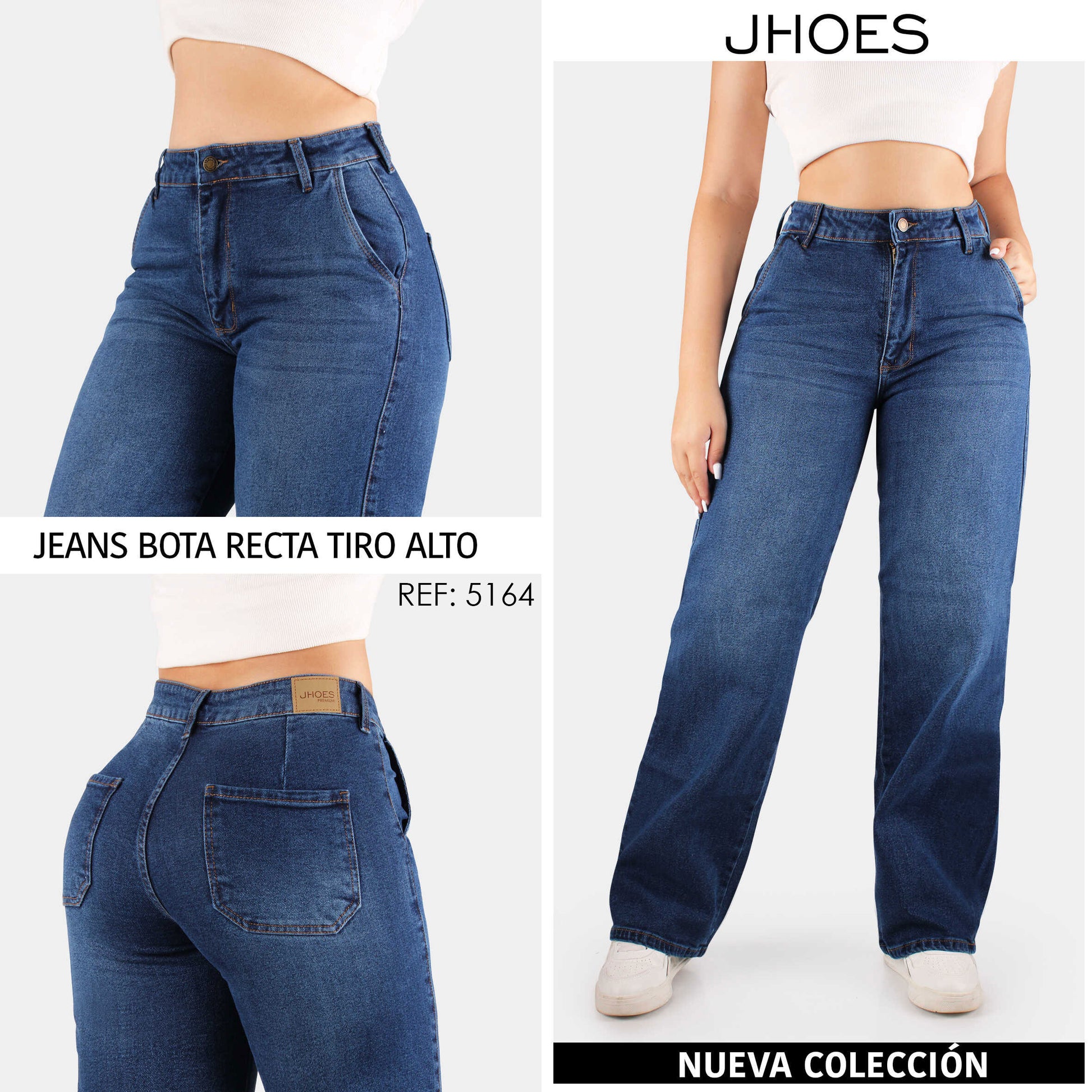 Jean Bota Recta Strech Levanta Cola , tiro alto, tono azul medio, cintura ajustada, el modelo mide 1.68 cm y usa talla 8.