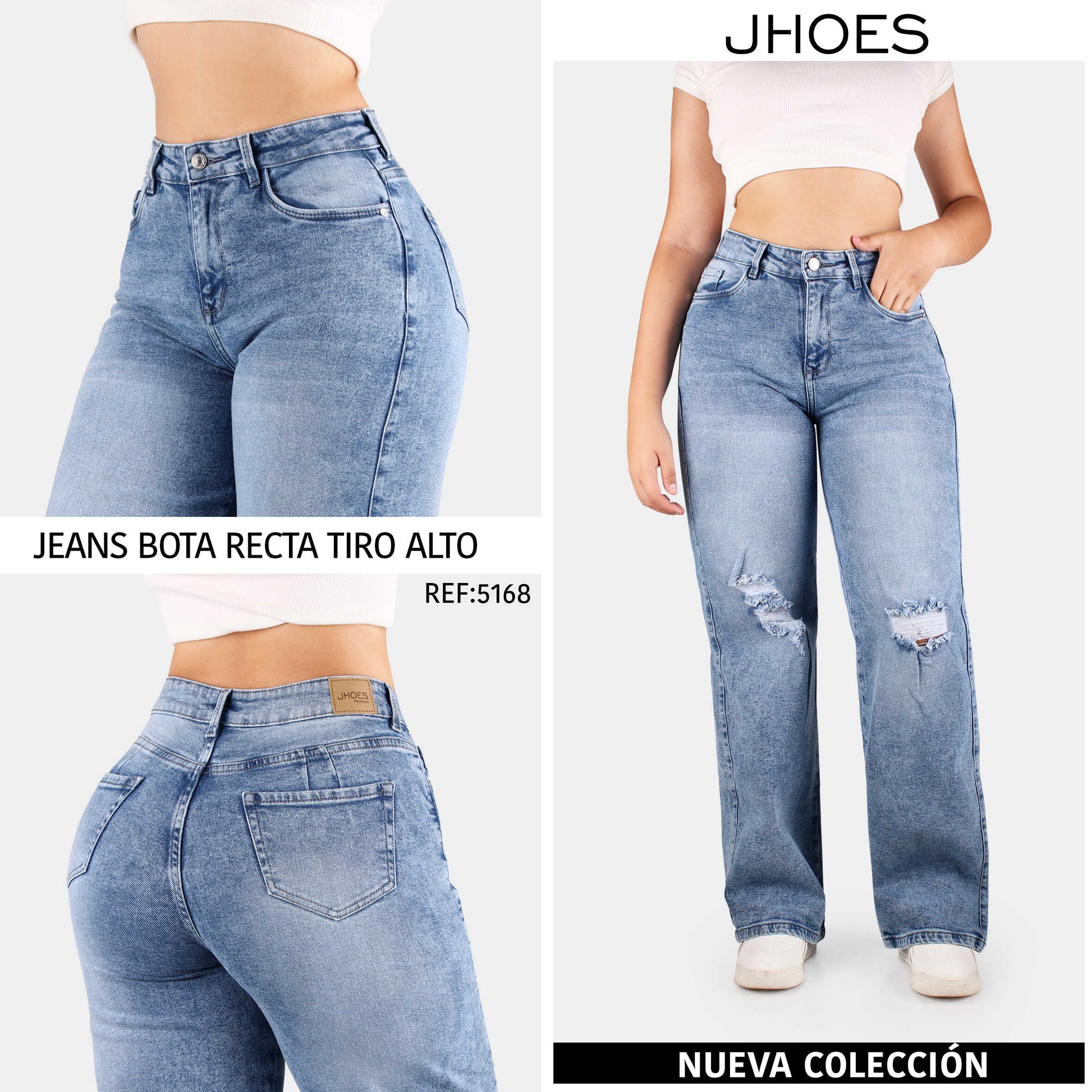 Jean Bota Recta Strech Levanta Cola , tiro alto, tono azul claro, cintura ajustada, el modelo mide 1.68 cm y usa talla 8.